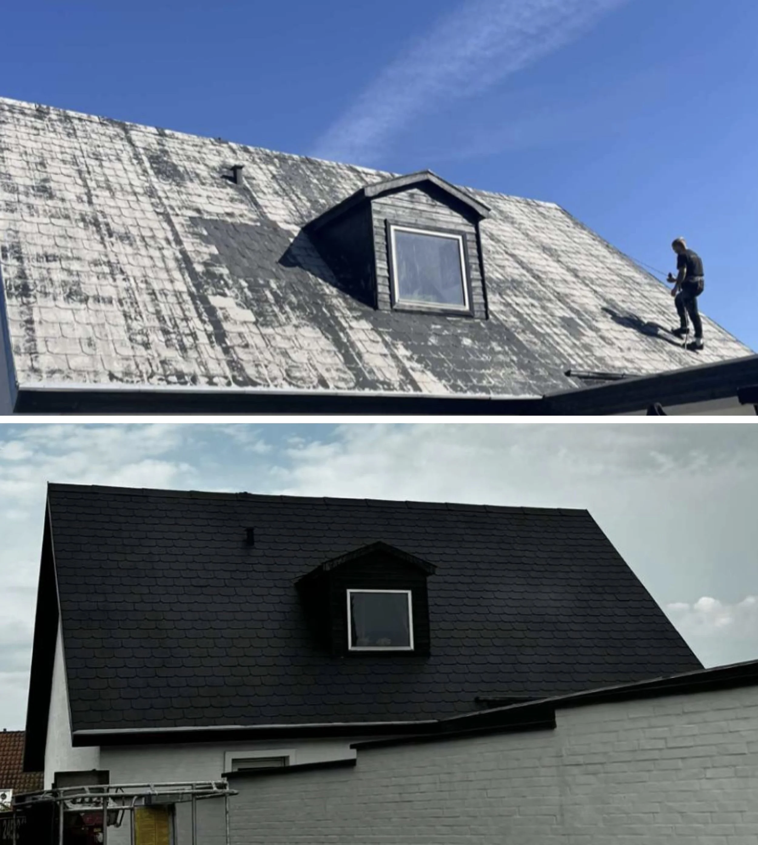 • Før og efter billeder af et tag, hvor det første billede viser et ældre, snavset og slidt tag, og det andet billede viser et nyt, rent og skinnende tag.