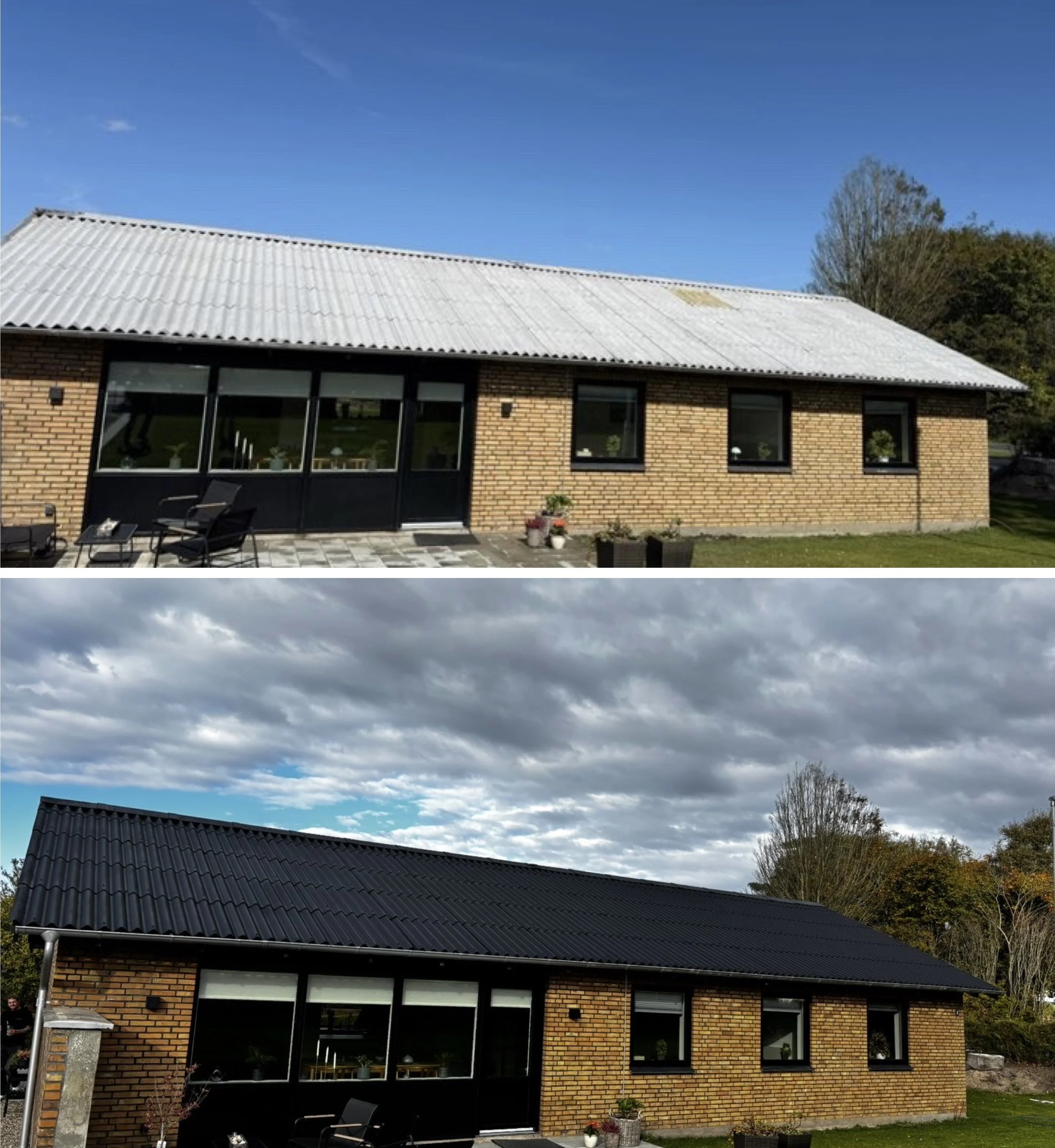 To billeder viser et hus med skiftende tagmaterialer; det øverste billede har et let, hvidt, tag med tagpap, og det nederste billede har et sort, rigtigt tag med tagplader.